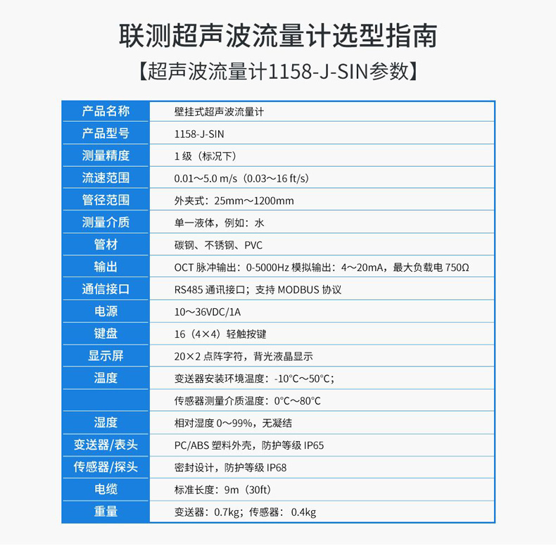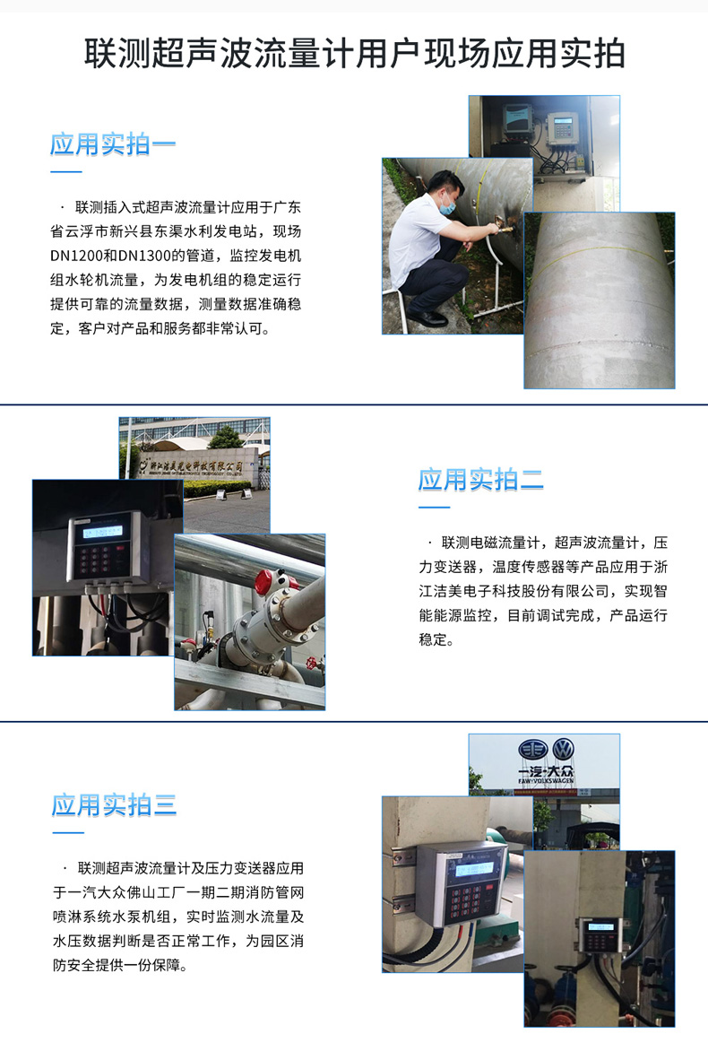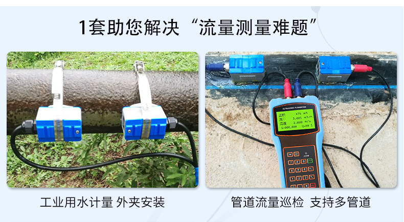 聯測超聲波流量計適合相對純凈液體流量的管外測量,尤其是在水流量測量、在工業循環水、空調制冷循環水、原水、高壓水、自來水,污水排放管等廣泛應用。