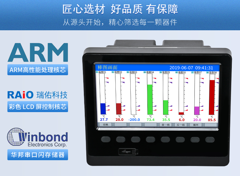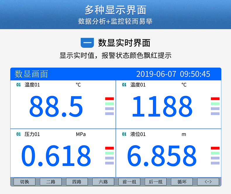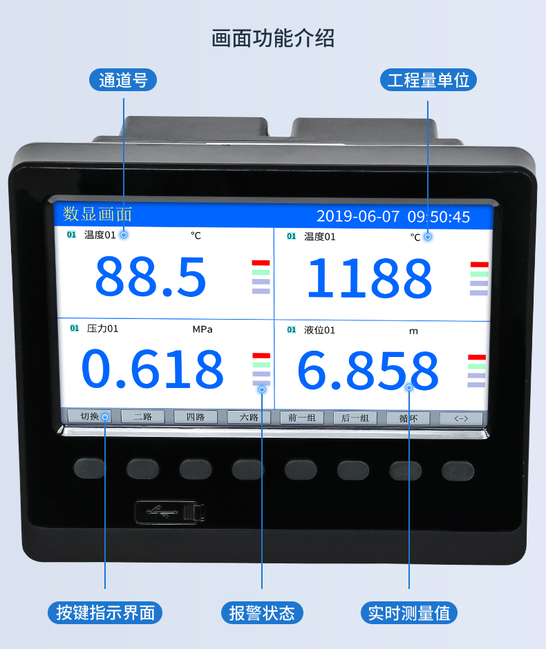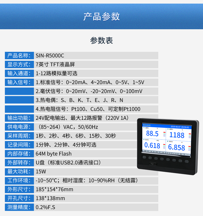 SIN-R5000C無(wú)紙記錄儀 12 路萬(wàn)能輸入(可組態(tài)選擇輸入:標(biāo)準(zhǔn)電壓、標(biāo)準(zhǔn)電流、熱電偶、熱電阻、毫伏等)。可帶 12 路報(bào)警輸出或 6 路模擬量變送輸出,RS485 通訊接口,以太網(wǎng)接口,微型打印機(jī)接口和 USB 接口,SD 卡插座;可提供傳感器配電;具有強(qiáng)大的顯示功能,實(shí)時(shí)曲線顯示,歷史曲線追憶,棒圖顯示,報(bào)警列表顯示等。人性化的外觀設(shè)計(jì)、完美的功能體現(xiàn)、可靠的硬件品質(zhì)、精湛的制造工藝,使儀表具有更高的性能價(jià)格比。