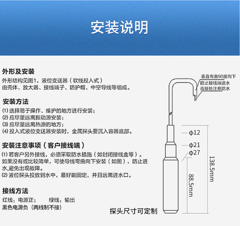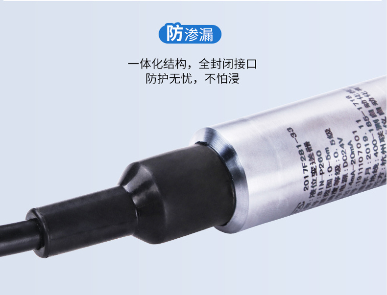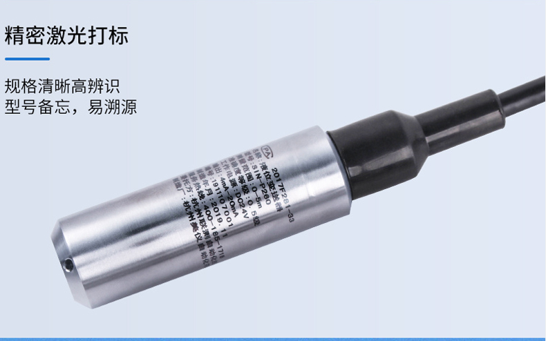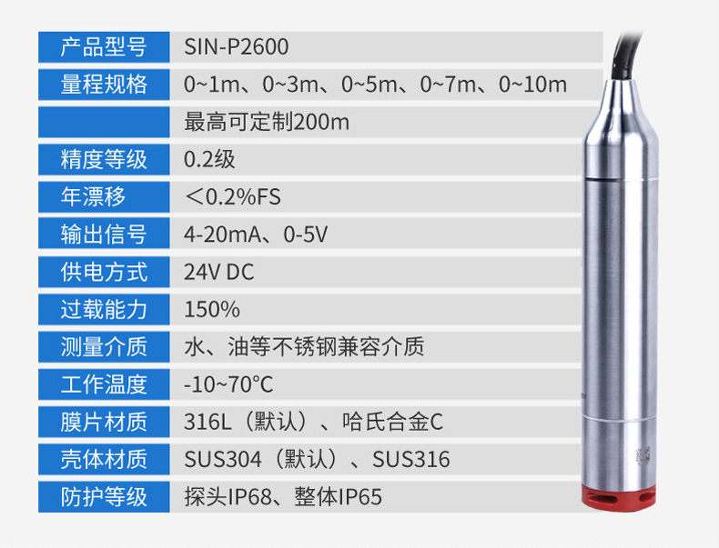 SIN-P260/P2600投入式液位變送器由高性能擴散硅壓阻式壓力傳感器作為測量元件,把與液位深度成正比的液體靜壓力準確測量出來,并經過信號調理電路轉換成標準(電流或電壓)信號輸出,建立起輸出信號與液體深度的線性對應關系,實現對液體深度的測量。