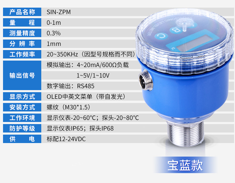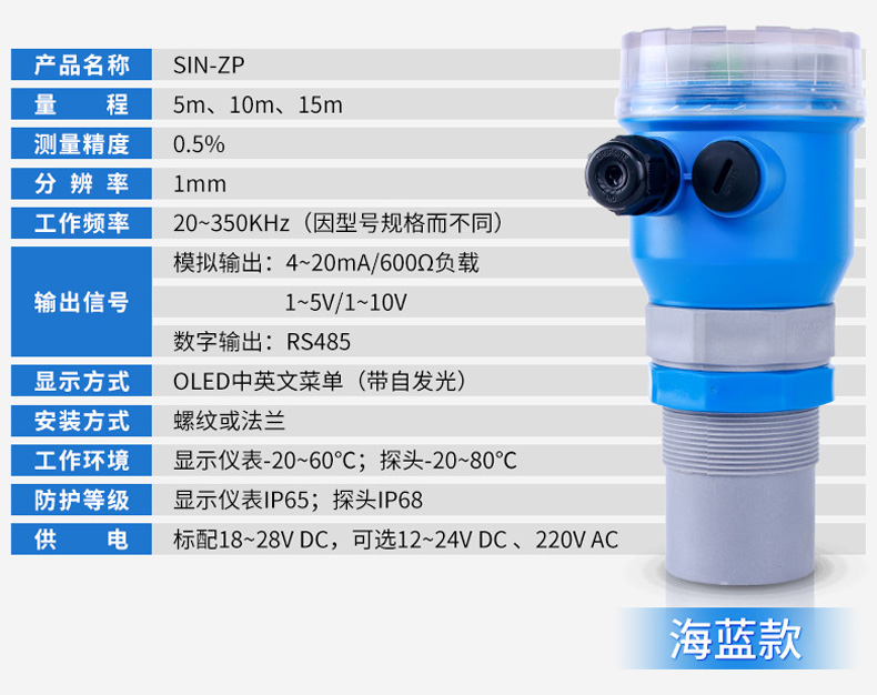 SIN-MP超聲波液位/物位計采用超聲波脈沖原理進行非接觸式的測量,是一種非接觸式、高可靠性、高性價比、易安裝維護的物位測量儀器。它不必接觸介質就能滿足大部分物位測量要求,集液位水位測距顯示變送等功能于一體,被測介質幾乎不受限制,可廣泛應用于各種液體和固體物料高度的測量。